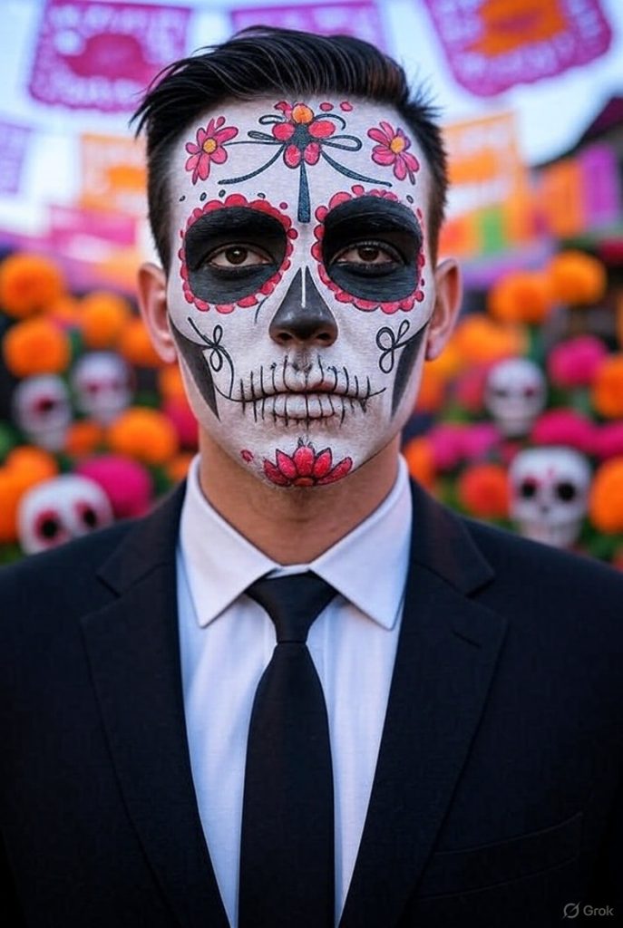 - Maquillaje de Calavera (Catrín): Es el elemento clave. Pinta tu cara como una calavera elegante (Catrín). Hay muchos tutoriales sencillos en línea.