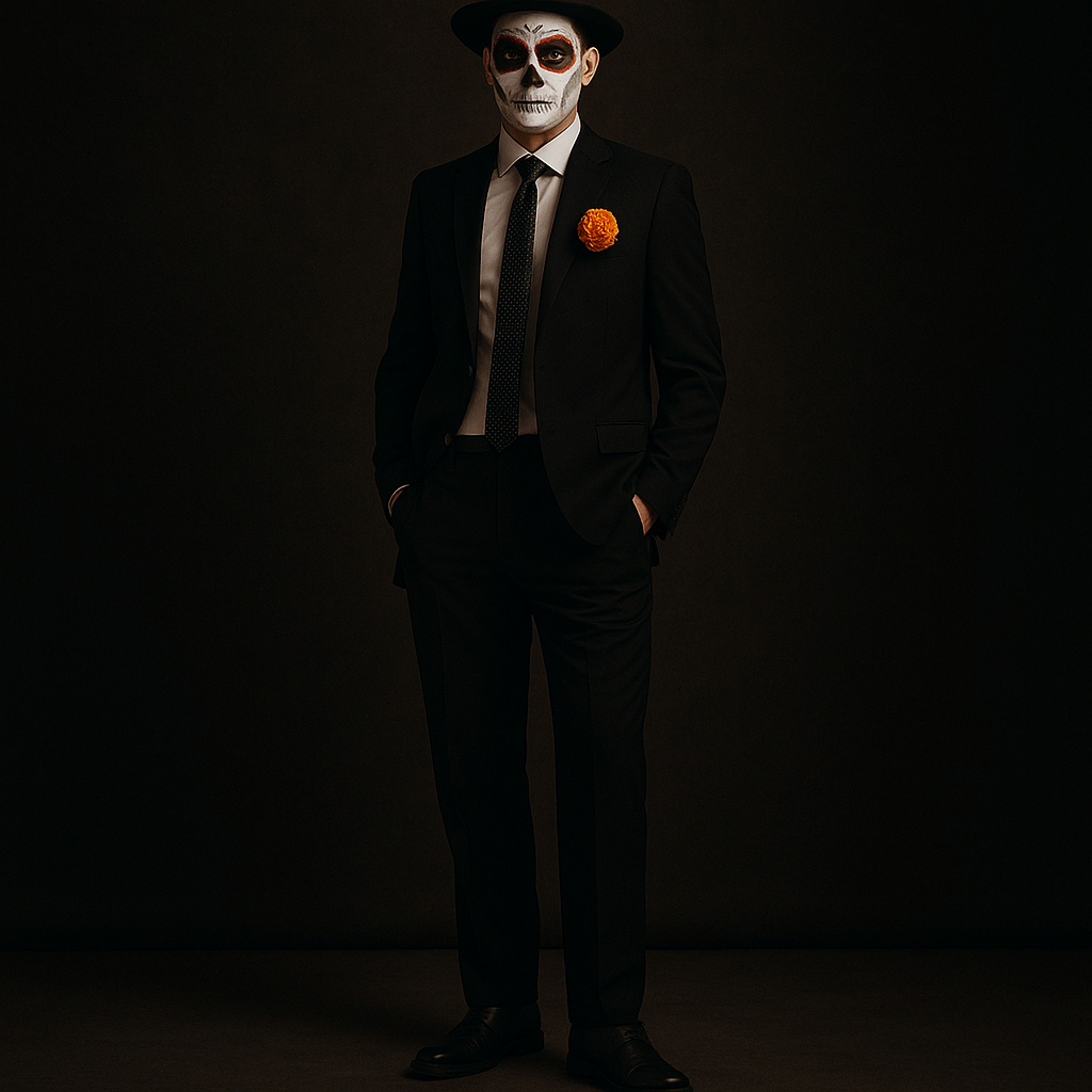 Este disfraz es una reverencia a la tradición mexicana del Día de Muertos. El maquillaje de Catrina o Catrín es central, creando una calavera estilizada con diseños florales, telarañas o geométricos en blanco, negro y toques vibrantes. Se pueden añadir gemas o brillantina.