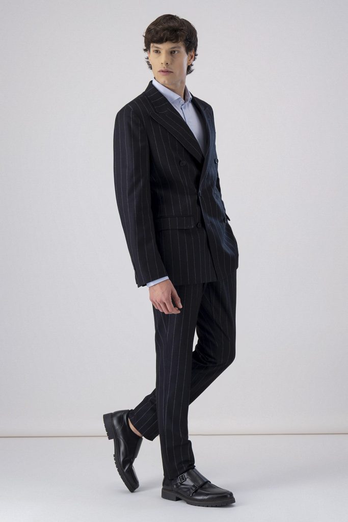 - Base: Traje de tres piezas (pantalón, chaleco y saco) en color gris, azul marino o tweed. Camisa blanca o de rayas finas.