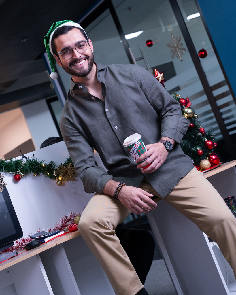 Para este evento, el menos formal de la temporada, ya sea en un contexto familiar o de trabajo, no es necesario que te preocupes demasiado. Puedes optar por un look smart casual: combina unos pantalones chinos con una polo y un saco o abrigo. Otra excelente opción es un suéter, ¡la prenda en tendencia de la temporada!